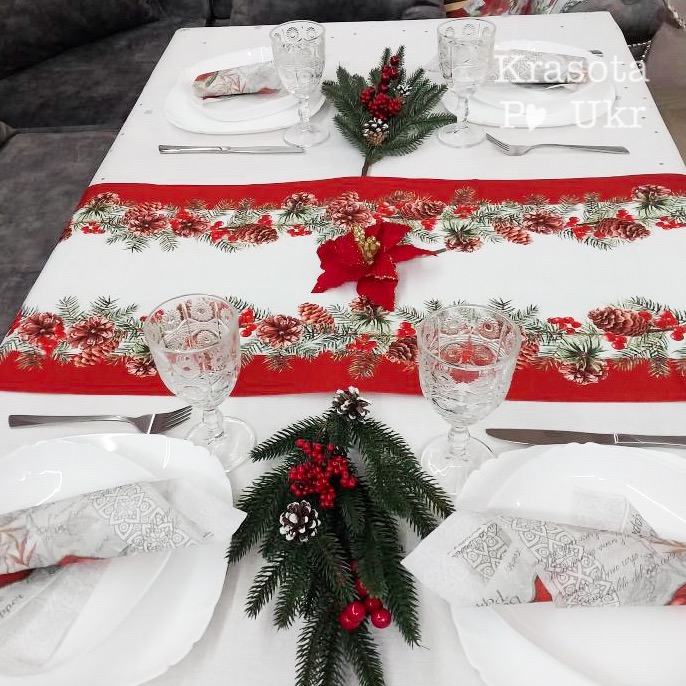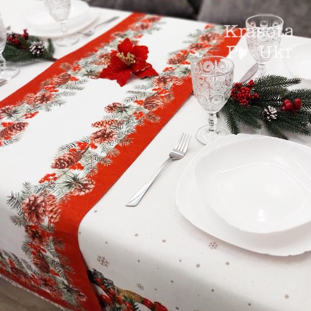 Скатертина-ранер 40*120 см, “Класика Різдва” з шишками, калиною та хвоєю